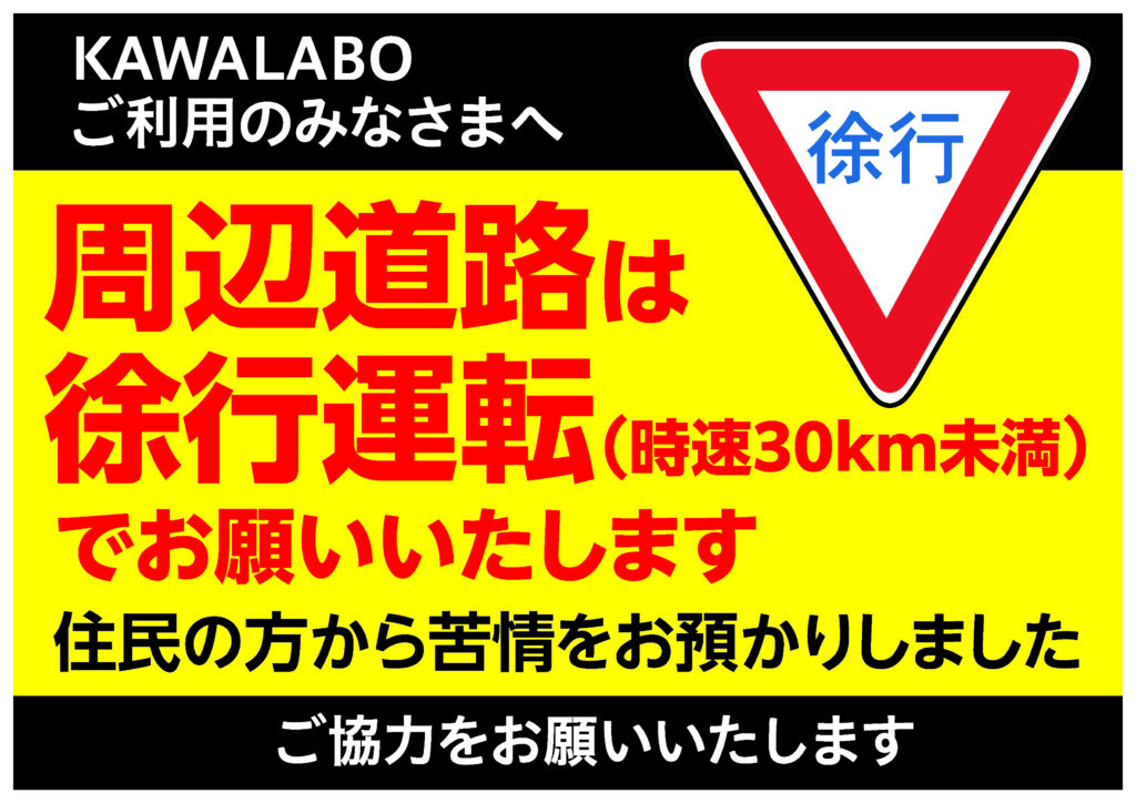 KAWALABOご利用のみなさまへ 2025年12月12日 最終更新日時 : 2025年12月12日 kaneko KAWALABO周辺道路は徐行運転(時速30km未満)でお願いいたします。住民の方から苦情をお預かりしました。ご協力をお願いいたします。