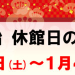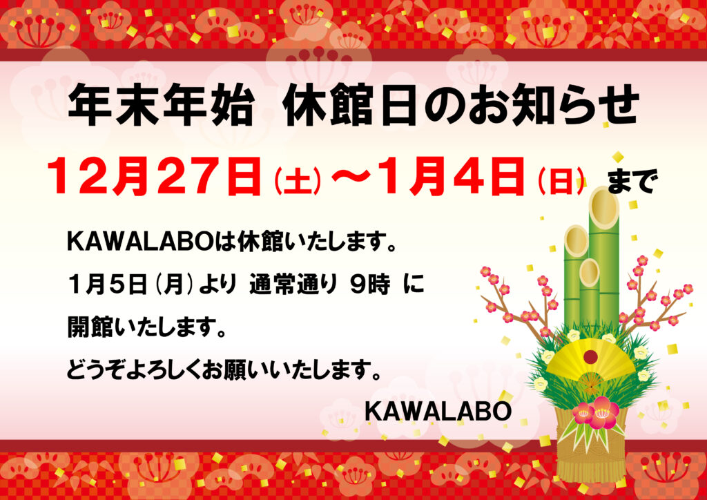 年末年始 休館日のお知らせ 2025年12月24日 最終更新日時 : 2025年12月24日 kaneko KAWALABOは、12月27日(土)〜1月4日(日)まで休館いたします。 1月5日(月)より通常通り9時に開館いたしますので、どうぞ宜しくお願いいたします。