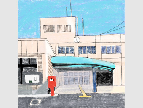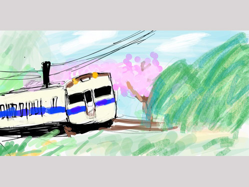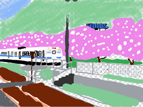 いつもみている採銅所駅は桜はさいていなかったけど、春になると桜がまんさいだったので、採銅所駅をかきました。